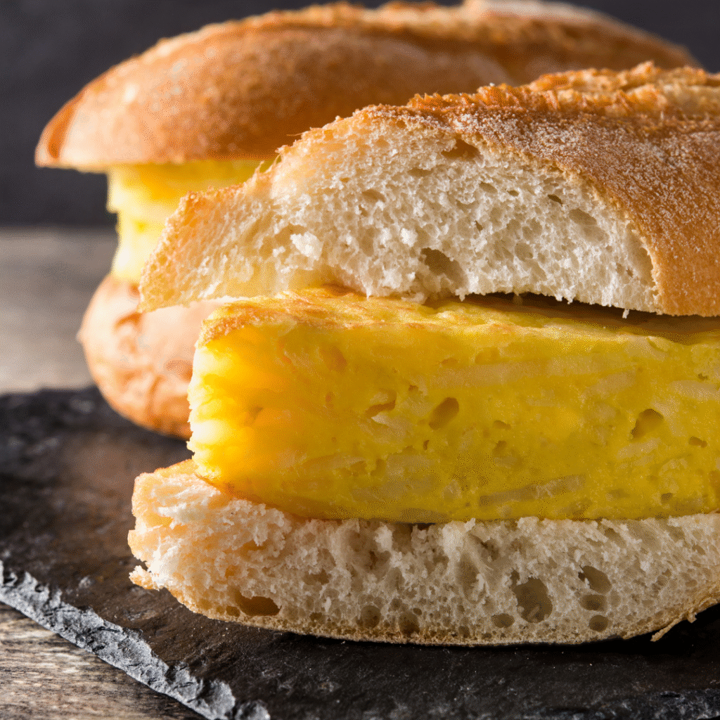 Bocadillo en pan chapata crujiente, con jamón serrano, queso brie, rúcula fresca, tomate y un toque de aceite de oliva virgen extra.