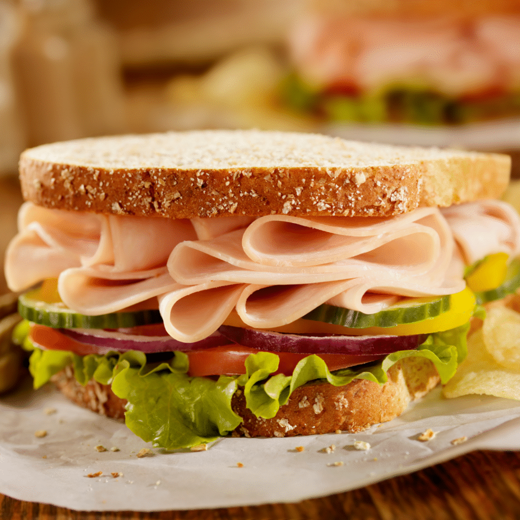 Jamon de pavo, jamón york, queso americano sobre una base de aguacate cremoso y vegetales frescos de lechuga y tomate. Todo integrado con y mayonesa clásica en nuestro pan chapata de corteza firme.