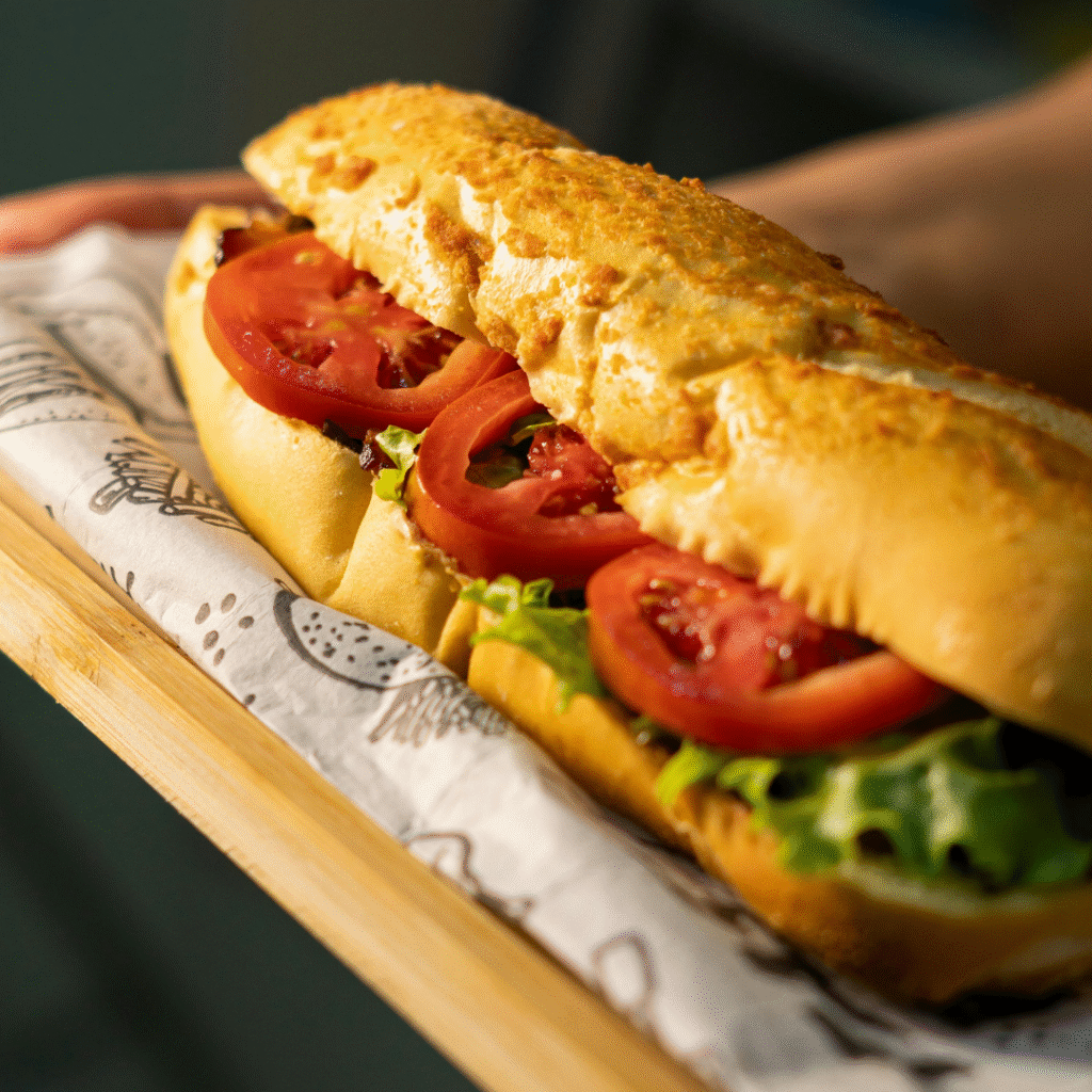 Bocadillo de pan chapata relleno de pollo a la plancha aromatizado, bacon, queso edam, lechuga, tomate y mayonesa casera, una combinación sabrosa y equilibrada.