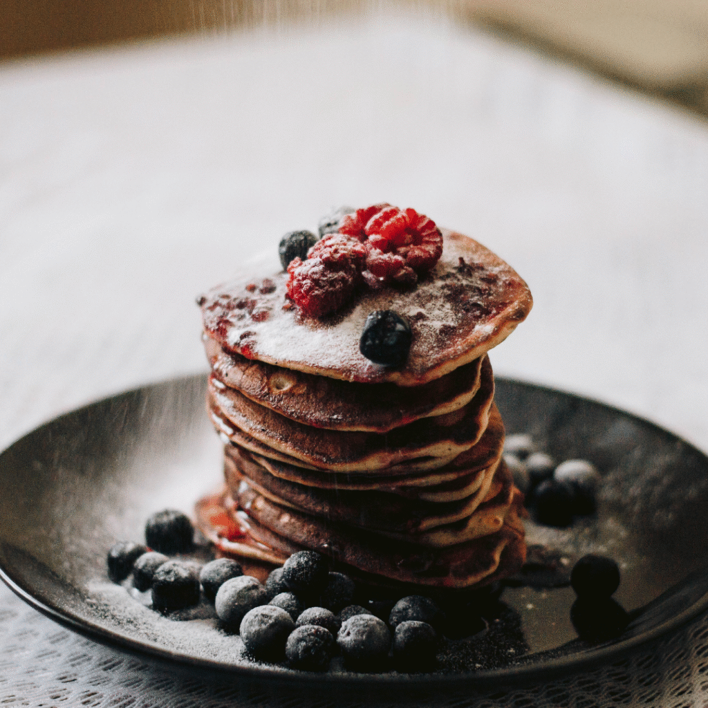 Pancake tierno y dorado, cubierto con frutos rojos jugosos y una irresistible crema cheesecake cremosa y acompañada de sirope fresa llena de sabor.